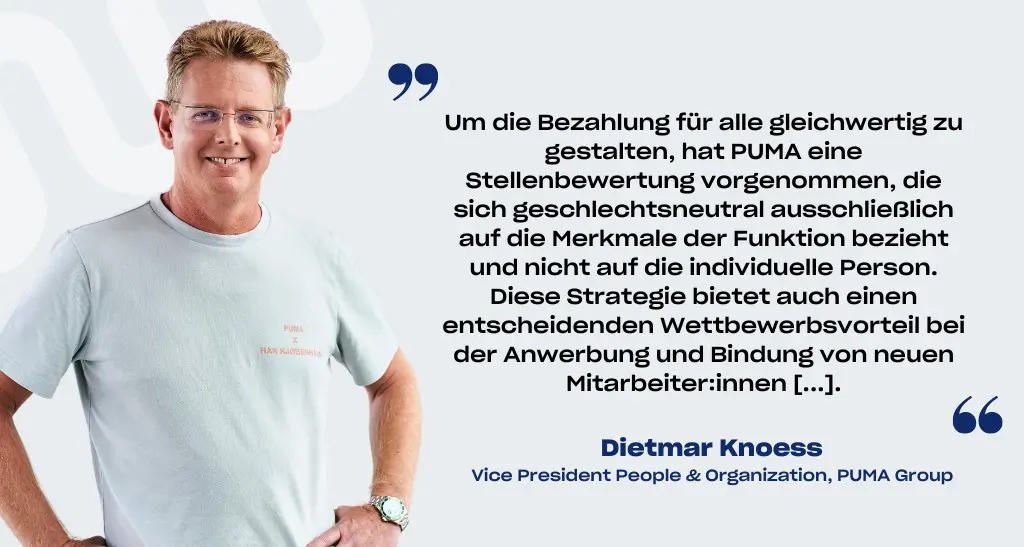Dietmar Knoess, Global Director People & Organization beim Sportartikelhersteller aus Herzogenaurach, sagt dazu im kununu ZukunftsPanorama: „Eine faire Vergütung frei von Diskriminierung bei PUMA sicherzustellen, ist eine unserer strategischen Prioritäten. Um die Bezahlung für alle gleichwertig zu gestalten, hat PUMA eine Stellenbewertung vorgenommen, die sich geschlechtsneutral ausschließlich auf die Merkmale der Funktion bezieht und nicht auf die individuelle Person.“
