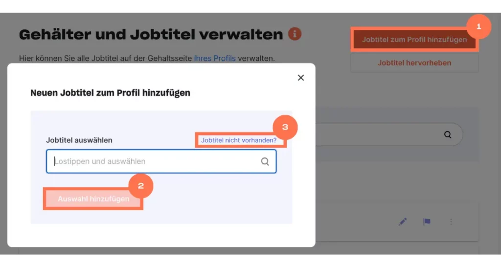Ergänzen Sie fehlende Berufsbezeichnungen, damit Ihr Unternehmen noch vollständiger und transparenter auf kununu abgebildet wird. Dazu einfach in Jobtitel rechts oben auf den Button Jobtitel zum Profil (1) hinzufügen klicken. Daraufhin öffnet sich ein kleines Fenster, in dem Sie den gewünschten Jobtitel eingeben können und diesen anschließend bestätigen mit einem Klick auf den Button Auswahl hinzufügen (2).